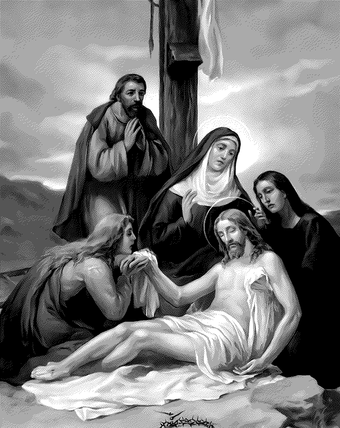 Meditation: Consider how, after Our Lord had died, He was taken down from the cross by two of His disciples, Joseph and Nicodemus, and placed in the arms of His afflicted Mother. She received Him with unutterable tenderness and pressed Him close to her bosom.