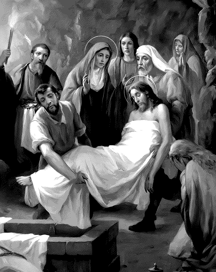 Meditation: Consider how the disciples carried the body of Jesus to its burial, while His holy Mother went with them and arranged it in the sepulcher with her own hands. They then closed the tomb and all departed.