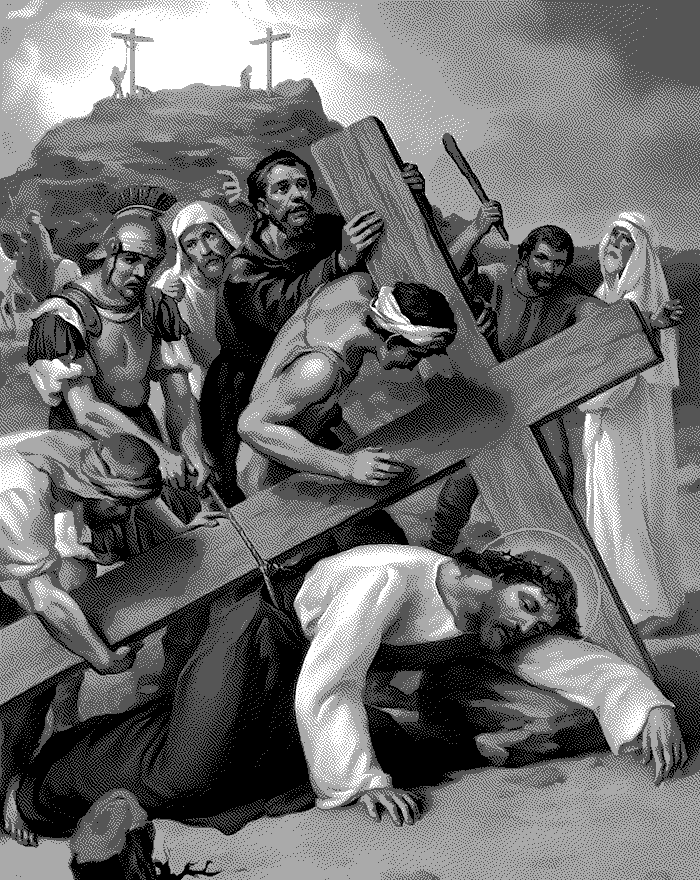 Meditation: Consider how Jesus Christ fell for the third time. He was extremely weak and the cruelty of His executioners was excessive; they tried to hasten His steps though He hardly had strength to move.